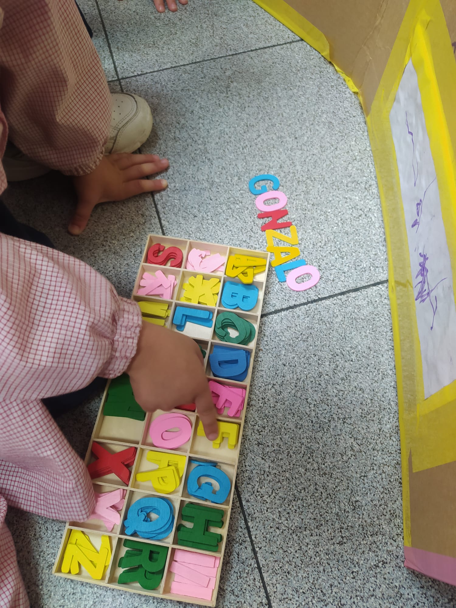 Escribimos nuestros nombres utilizando las letras de madera y fijándonos en el modelo que nos da la profe. ¡Todos queríamos probarlo!.