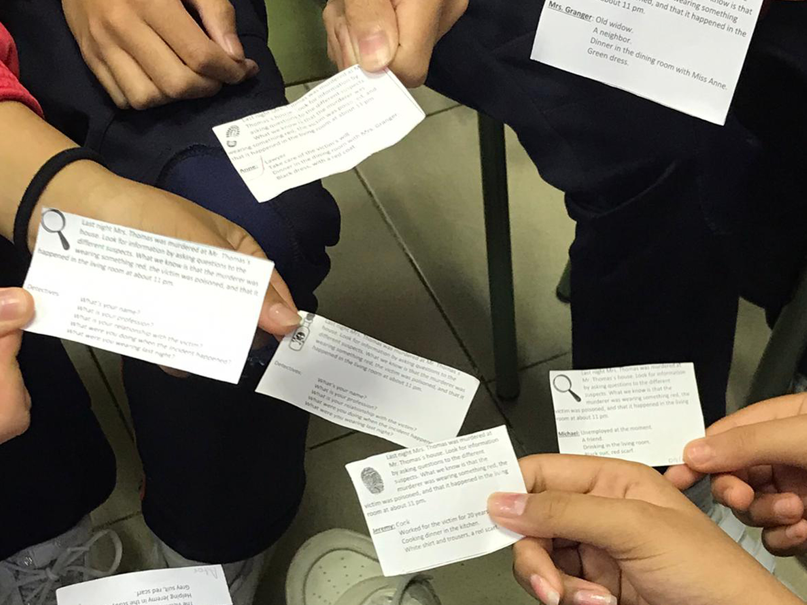 Cada uno tiene un personaje y nos investigamos unos a otros en inglés para dar con el criminal. ¡Ha sido muy divertido!